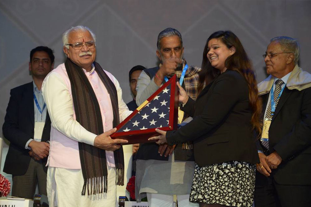 Ms. Alicia Kaur gifting US Flag to Chief Minister of Haryana , India at 50th Haryana Diwas , Pravasi Bhartia Diwas